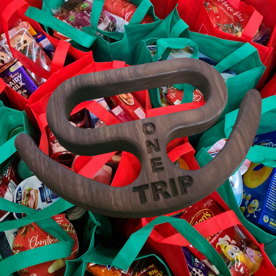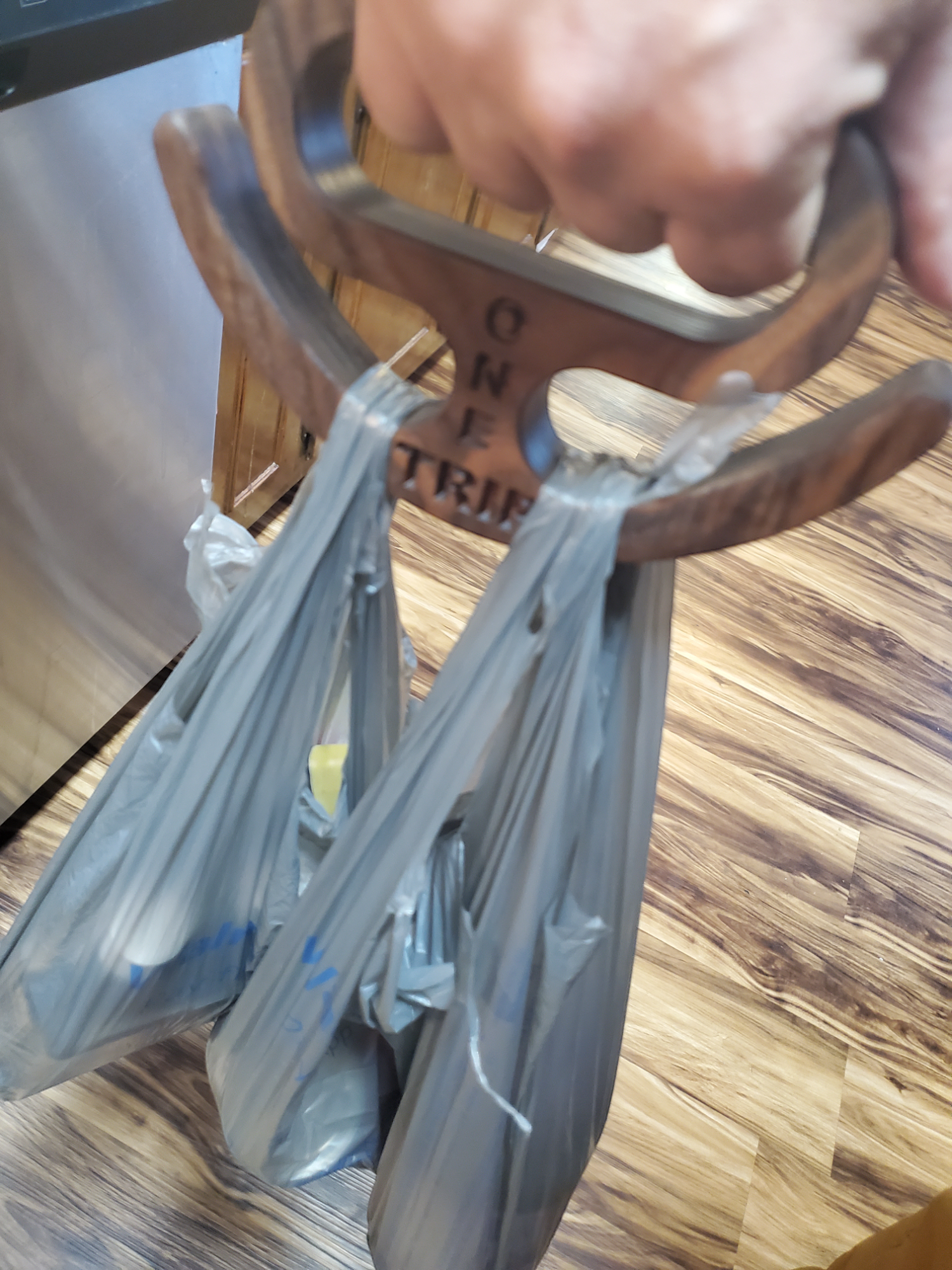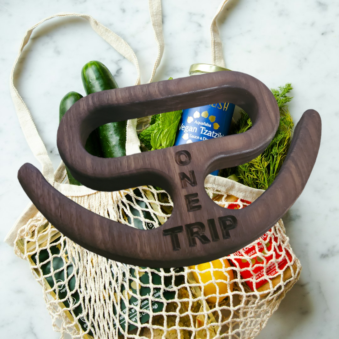 - Simply loop your grocery bag handles onto the hooks, lift the **One Trip** by its ergonomic handle, and you’re ready to go. No more struggling with multiple bags cutting into your hands or making multiple trips.